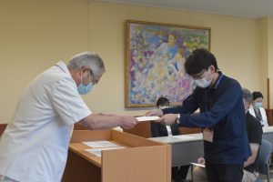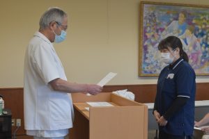 辞令交付式では、山内理事長が一人一人に辞令書を手渡しました。理事長は「これから、医和生会の未来のために頑張ってほしい」とエールを送りました。