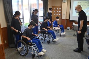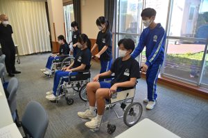 生徒は2人1組で車いすに1人を乗せ、もう1人が操作。