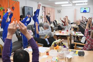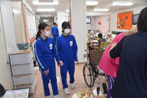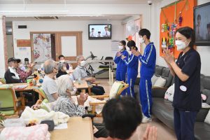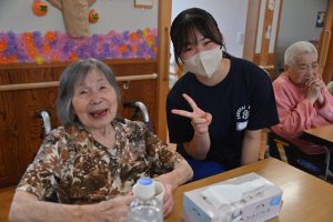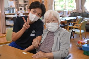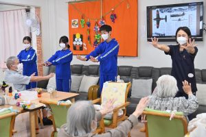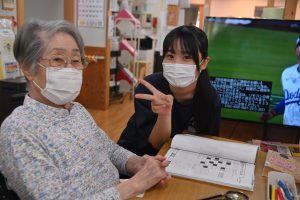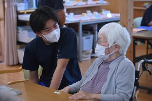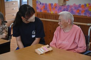 元気に体を動かすご利用者様から「若いっていいね。若いうちに色々頑張るんだよ」「長い人生、負けないでね」と人生の先輩からエールを受け、笑顔を見せていました。
