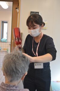 二日目の午前中は入浴を終えたご利用者様に「熱くないですか?」と声をかけながらドライヤーをかける体験も。