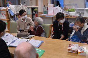 初日午後はご利用者様とコミュニケーション。学生はご利用者様の隣に腰掛けて会話を楽しみます。