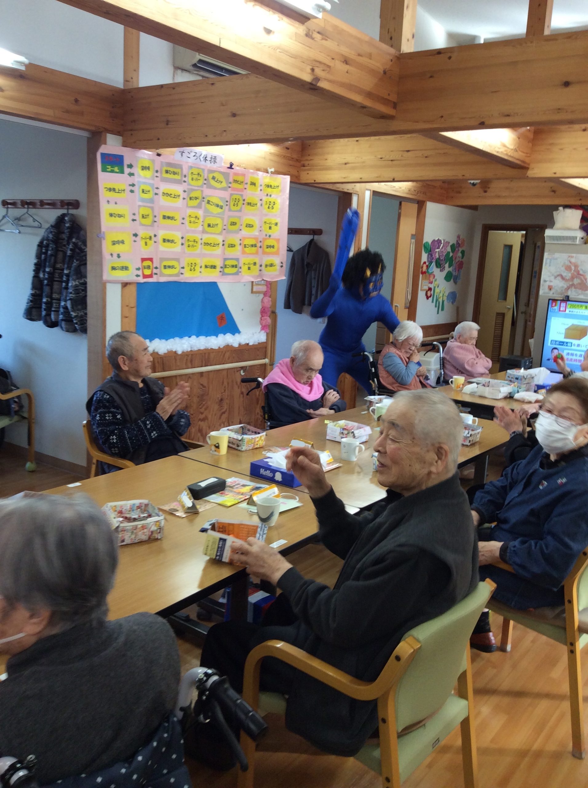 ご利用者様からは「楽しかった」という声。職員も「楽しめた」と満足感を漂わせていました。豆まきの前段では、ご利用者様がうどんとお稲荷さんを調理し、みんなでランチを楽しみました。