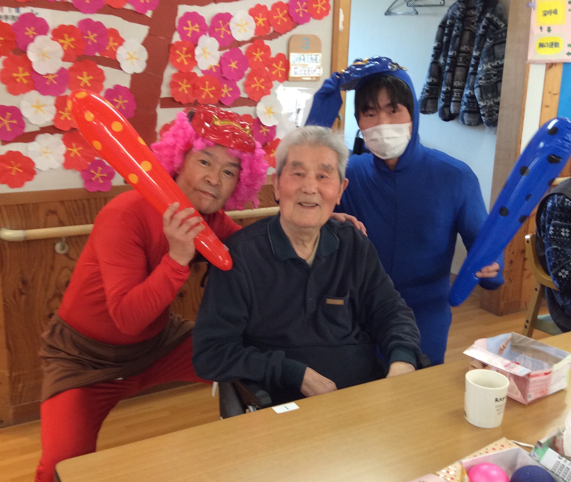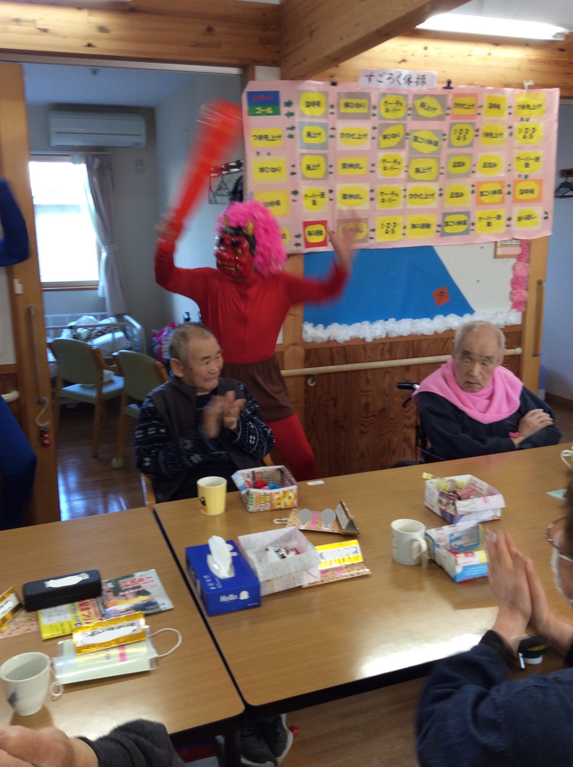 いわき市の小規模多機能型すばるのご利用者様がこのほど、豆まきを楽しみました。ご利用者様に楽しんでもらおうと、すばるらしい節分イベントが企画されました。豆まきでは管理者自ら赤タイツに身を包んで赤鬼に変装。他の職員が扮した青鬼とともに、盛り上げました。